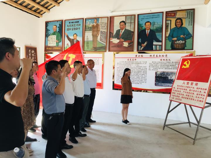 在黃士韜故居,在莊嚴(yán)的黨旗下,黨員們舉起右手緊握拳頭,用鏗鏘有力、慷慨激昂的宣誓聲再次重溫入黨誓詞。