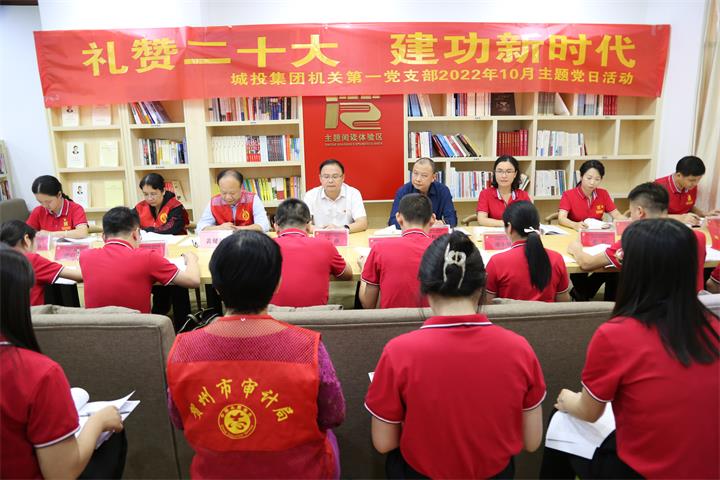 發(fā)布時(shí)間:2022-11-01 作者:圖文/吳姍 來源:本站原創(chuàng) 審核:葉茂桃 鄧永劍為深入學(xué)習(xí)貫徹黨的二十大精神,10月31日,城投集團(tuán)機(jī)關(guān)第一黨支部在市人才公寓開展“禮贊二十大建功新時(shí)代”10月主題黨日活動(dòng)。集團(tuán)黨委書記、董事長(zhǎng)黃俊,黨委副書記、工會(huì)主席梁輝露,黨委委員、紀(jì)委書記吳澤蓮以普通黨員身份參加活動(dòng)。市審計(jì)局黨組成員、經(jīng)責(zé)分局局長(zhǎng)黃健斌率市審計(jì)局赴城投集團(tuán)審計(jì)組成員參與活動(dòng)。支部書記湯彩燕主持會(huì)議。支部全體黨員參加活動(dòng)。