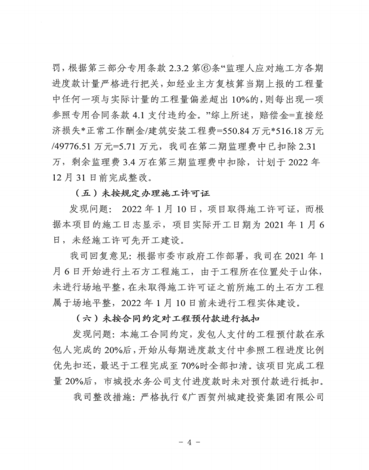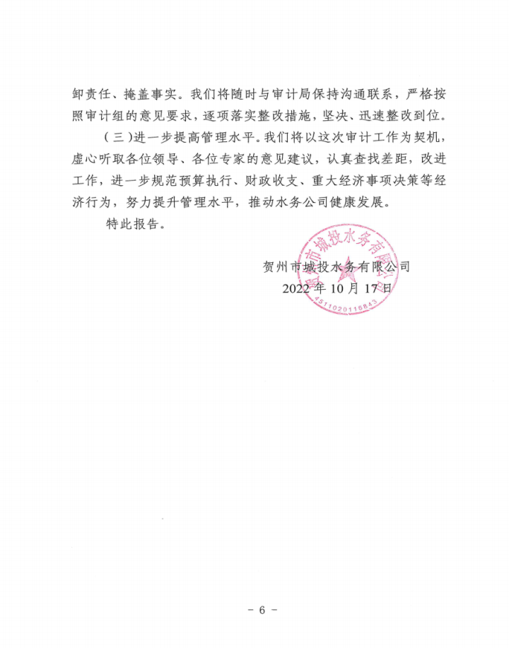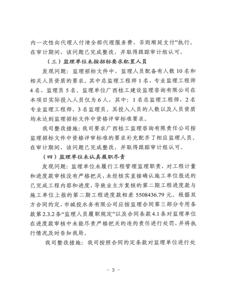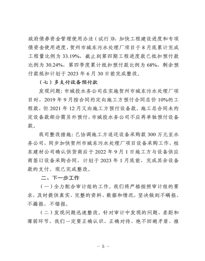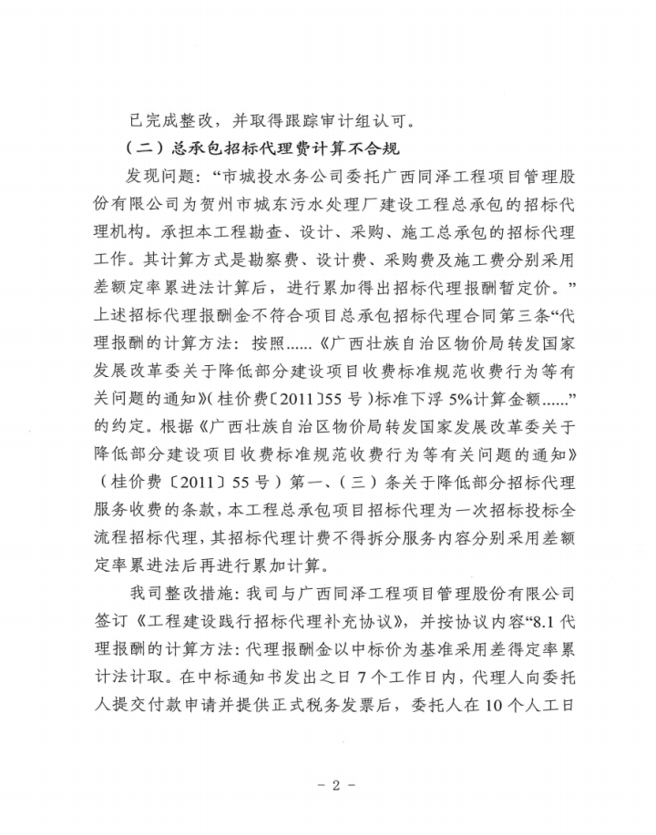賀州市城投水務(wù)公司關(guān)于賀州市城東污水處理廠建設(shè)工程跟蹤審計(jì)發(fā)現(xiàn)問題整改情況的報(bào)告