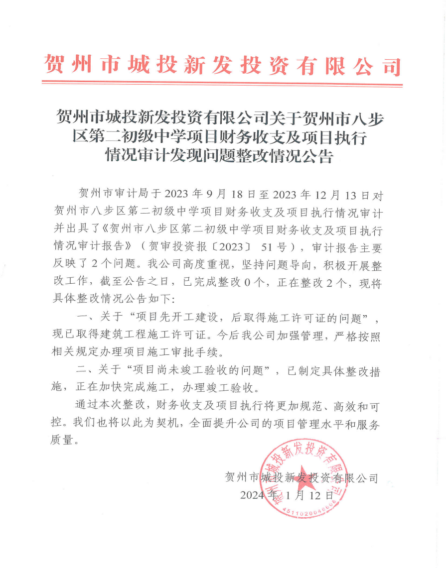 下一篇:廣西賀州城建投資集團(tuán)有限公司2022年度財務(wù)收支情況審計整改情況公告