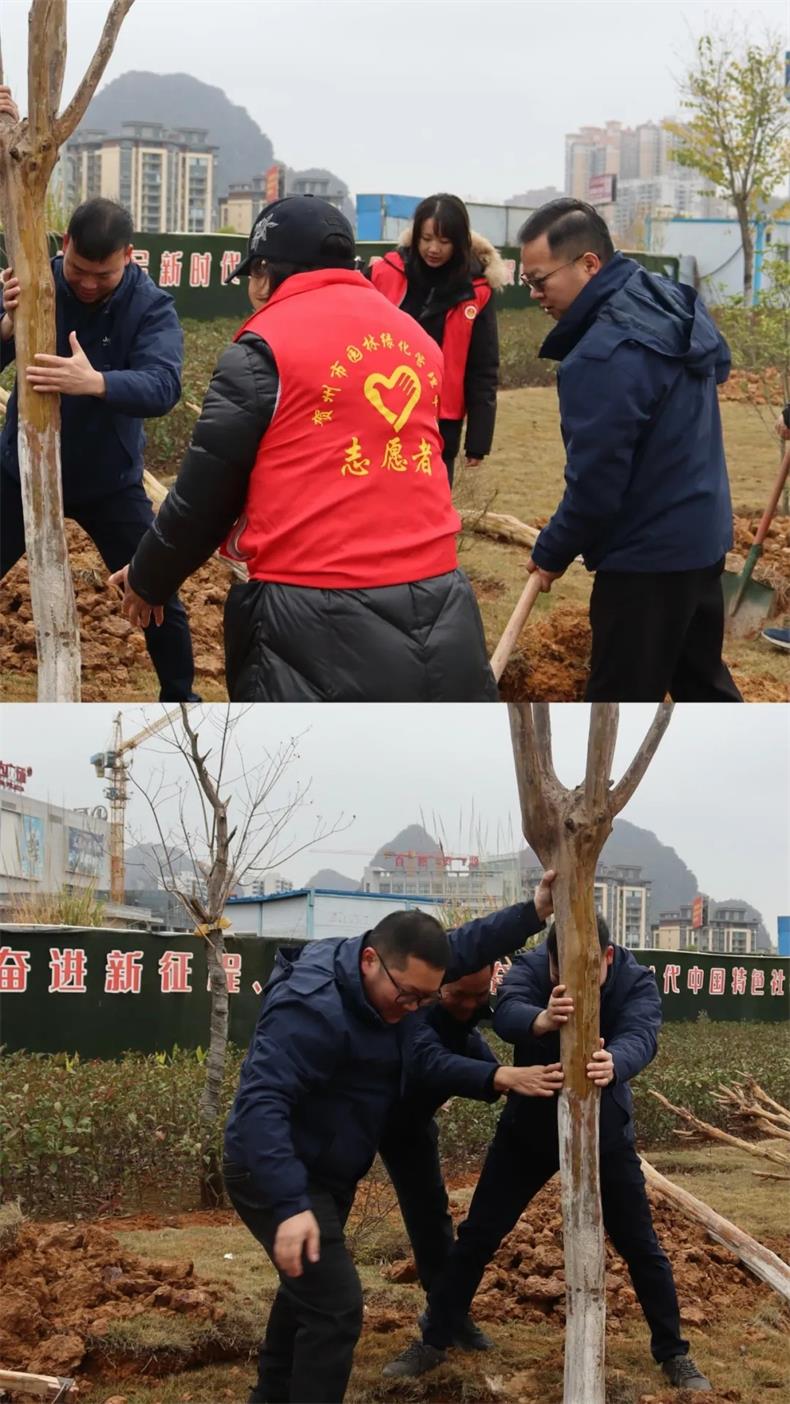 在植樹現(xiàn)場(chǎng),大家仔細(xì)傾聽(tīng)工作人員講解植樹的注意事項(xiàng)及植樹要求,隨后到負(fù)責(zé)區(qū)域熱火朝天開(kāi)始植樹。大家人手一件植樹工具,分工協(xié)作,配合默契,扶正樹木、揮鍬鏟土、回填泥土、提水澆樹,每一個(gè)環(huán)節(jié)都井然有序。能源公司黨支部合力栽植10余棵樹,用實(shí)際行動(dòng)種下了春天的美好,為賀州增加了一抹新綠。